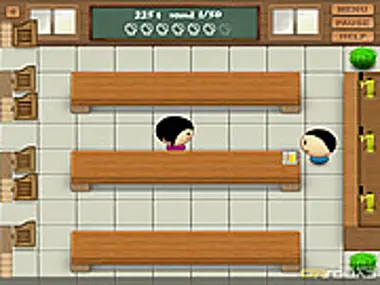 The crowd is thirsty and running in the bar. Throw beers to push them out and be aware to not break anything. Use cash to level up your skills.