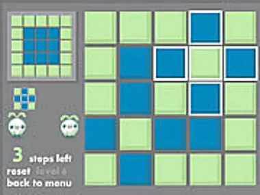 In BlokBlok, you solve puzzles. Guided by excited sprites, your goal is to create blocked images to the liking of these little guys. After selecting a cursor setting, you flip the blocks of a level into the positions of their example. This can only be done in limited steps, so you have to choose wisely when you make a move! The goal of the game is to unlock and finish all levels. The faster you solve the puzzles, the more gratitude of the BlokBloks! Can you achieve three stars on each level?