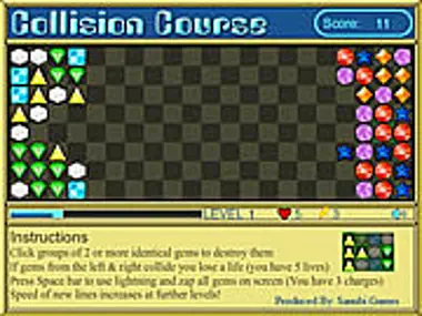 A fast paced arcade-style matching game that involves hand-eye coordination and strategy.Click groups of 2 or more identical gems to destroy them. If gems from the left and right collide, you lose a life.