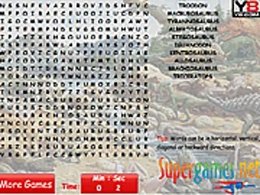 Find all 10 dinosaurs on the word list. The letters scramble every new game, so there is a new game every time you play. Click and drag to highlight the group of letters that make up the word. If the letters you highlighted are right, the word will fade in the word list.