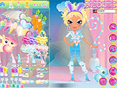 Click through the dress-up options at the top of the wardrobe. Drag items onto this bunny fanatic to create a fantastic outfit! Take a pic when you're done.