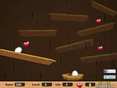 Carefully guide the egg into the nest. You have to click the platform to hold the egg and the nest when you want it to drop there. Collect all the hearts on the way. Complete each level to go to the next and all the levels to win the game.