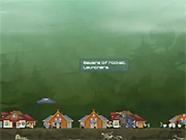 Beam up humans and power rods. Gain power to release robots to destroy buildings. Avoid missiles.