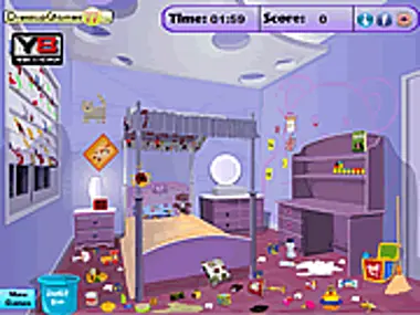 The playful baby crated a mess in his room. You have to clean the room and make it appear neat before he comes back to sleep. Get everything back in its place and sweep the floor clean before the baby comes back.