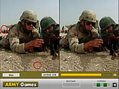 Play Military Units Difference game. In this awesome free online army game there are images with brave solders. In different level there are different images. The two images looks like the same but they have some differences. You have to find the differences. In each level there are totally 5 differences that you have to find in the given time. If you cant find the differences in the given time you can remove the time and you can play relaxed. Try not to make mistakes because if you click more than 5 times on the wrong place the game will be over. Game instruction: use the left key of your mouse to click on the difference that you will find. You will like this game especially if you like find the differences games. Concentrate and play. Have a lot of fun while playing this very fun find the difference army game!