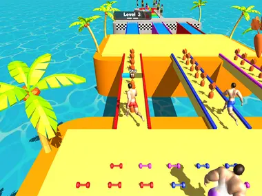 Muscle Bridge Race 3D on Y8.com is a fun and quirky collecting game where strength is the key to victory! Collect dumbbells along the track to bulk up your character, making him strong enough to push through obstacles and build bridges to advance. The more you collect, the bigger and buffer you get, giving you the power to outpace rivals. Reach the finish line in style and impress the ladies with your strength to claim the win in each level!