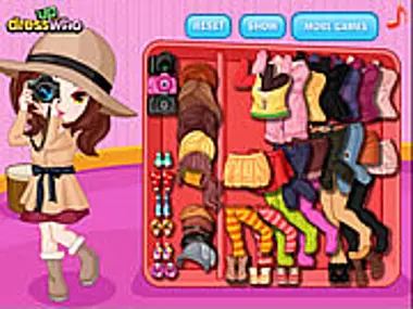 Play the "Photographer In Training" dress up game and help this cutie prepare to go out for a photo session in the sun with a very cool outfit! Check out her trendy chic wardrobe, pull out the clothing and accessories you like best of all to dress her up! Feel free to change the clothes several times until you find the right stuff for her! Have fun :)