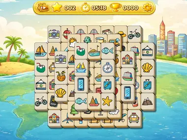 Travel Mahjong Deluxe is a relaxing tile-matching puzzle that takes you on a journey around the world. Match identical tiles to clear the board and reveal beautiful travel-themed icons like boats, bicycles, palm trees, and landmarks. Plan your moves carefully and remove tiles that are free on at least one side. Play the Travel Mahjong Deluxe game at Y8 now.